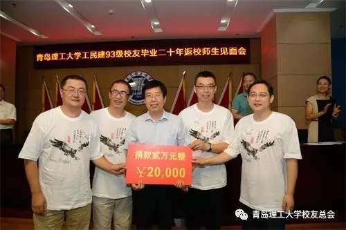 岁月如歌,四海相望二十载碧海为证,八方同窗会今朝7月8日上午,工民建93级校友毕业20年返校师生见面会在科技楼报告厅举行见面会上,建93级全体同学向“青岛理工大学教育发展基金会”捐款2万元人民币,用于支持学校及土木学院建设。