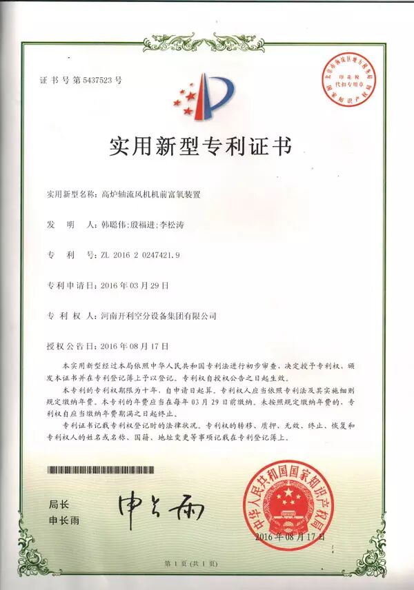 点击「气体分离订阅号」可快速关注微信号:qt168-2013★ 9月19日消息,国家知识产权局于近日向河南开利空分设备集团有限公司颁发了一项实用新型专利证书该实用新型专利涉及到一种新的高炉轴流风机机前富氧的装置,包括受控于控制系统的气动调节蝶阀、快速切断阀和涡轮传动蝶阀组成的调节阀组;氧气混合装置及相关的安全保护装置。