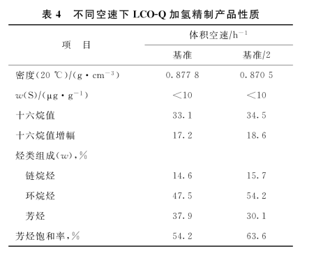 进而,以LCO-Q为原料油,在氢分压为12.0 MPa、氢油体积比为800 、反应温度为350 ℃的条件下,考察空速对产品性质的影响,结果见表4从表4可以看出,随着空速下降,芳烃饱和率明显提高,产品中总环烷烃的含量增加,十六烷值提高,印证了提高加氢深度有利于提高LCO的芳烃饱和率和产品十六烷值。