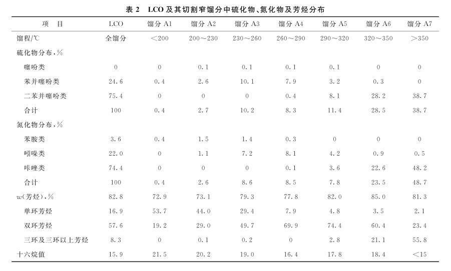 LCO窄馏分的组成分析结果如表2所示从表2可以看出:LCO中基本没有噻吩类硫化物;苯并噻吩类硫化物主要分布于馏程低于320 ℃的各个窄馏分段中,且主要集中在馏程为230~290 ℃的馏分段中;馏程高于290 ℃的馏分段中开始出现二苯并噻吩类。