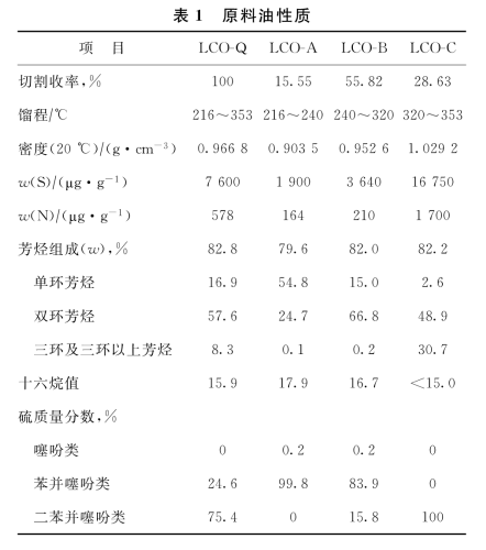(占比15.55%)、中馏分LCO-B(占比55.82%)及重馏分LCO-C(占比28.63%),其组成和性质见表1由表1可知:LCO-A中单环芳烃质量分数为54.8%,占LCO-Q中单环芳烃的50.4%,。