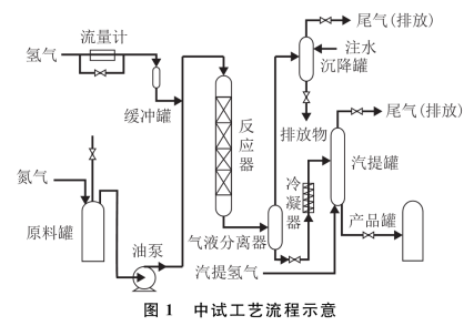 1.2 试验装置在加氢中型试验装置上进行LCO加氢试验研究,原料油和新氢一次通过,其工艺流程见图1试验用氢气为电解氢温度、压力和气体流量由计算机自动控制,温度控制精度为±1 ℃,压力控制精度为±0.01 MPa。