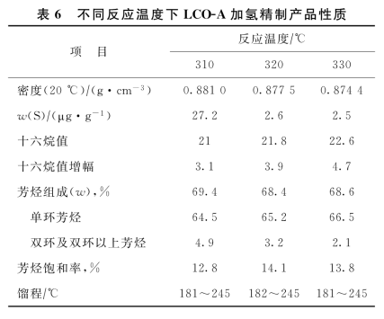 的条件下,考察反应温度对产品芳烃组成及十六烷值的影响,结果见表6从表6可以看出,随着反应温度升高,芳烃饱和率先提高再降低,单环芳烃含量逐渐增加,双环及双环以上芳烃含量逐渐降低由于单环芳烃很难加氢饱和,因而LCO-A。