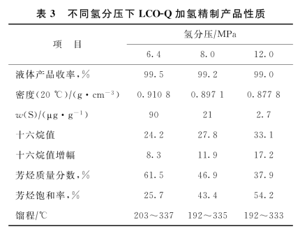 MPa时的加氢产品性质,结果见表3从表3可以看出:当氢分压由6.4 MPa提高至12 MPa时,所得产品的十六烷值由24.2提高至33.1,较LCO-Q提高8.3~17.2;芳烃饱和率由25.7%提高至54.2%。