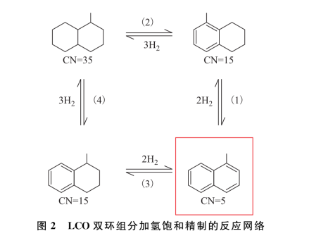 以1-甲基萘为模型化合物,解析LCO中双环芳烃组分加氢饱和的反应网络,如图 2 所示。
