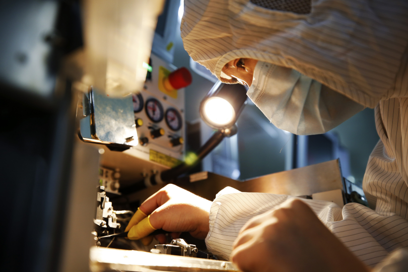 ▲2021年7月4日,江苏宿迁,工人在泗洪经济开发区一生产芯片的企业车间内忙碌。图/视觉中国