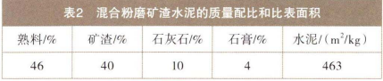 粉磨设备为Φ500mm×500mm的SM-500试验磨,入磨前将物料破碎至粒度<7mm,入磨的物料质量为5kg将熟料、石灰石和石膏破碎,矿渣烘干;将以上半成品物料按表2的质量配比和比表面积混合粉磨,制得混合粉磨矿渣水泥。