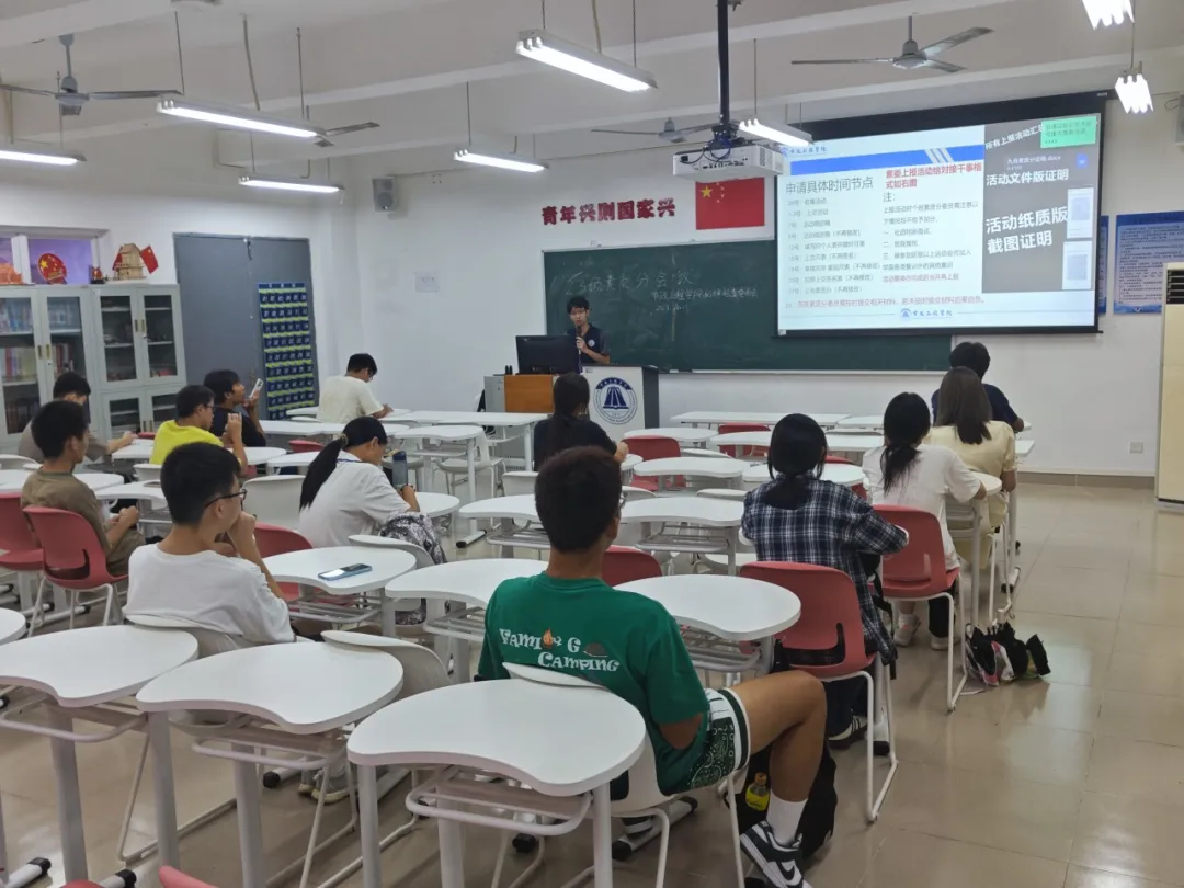 二是讲解素质分申请的具体时间节点,说明不能加分的素质分活动项目,如学院党课培训和各类训练。