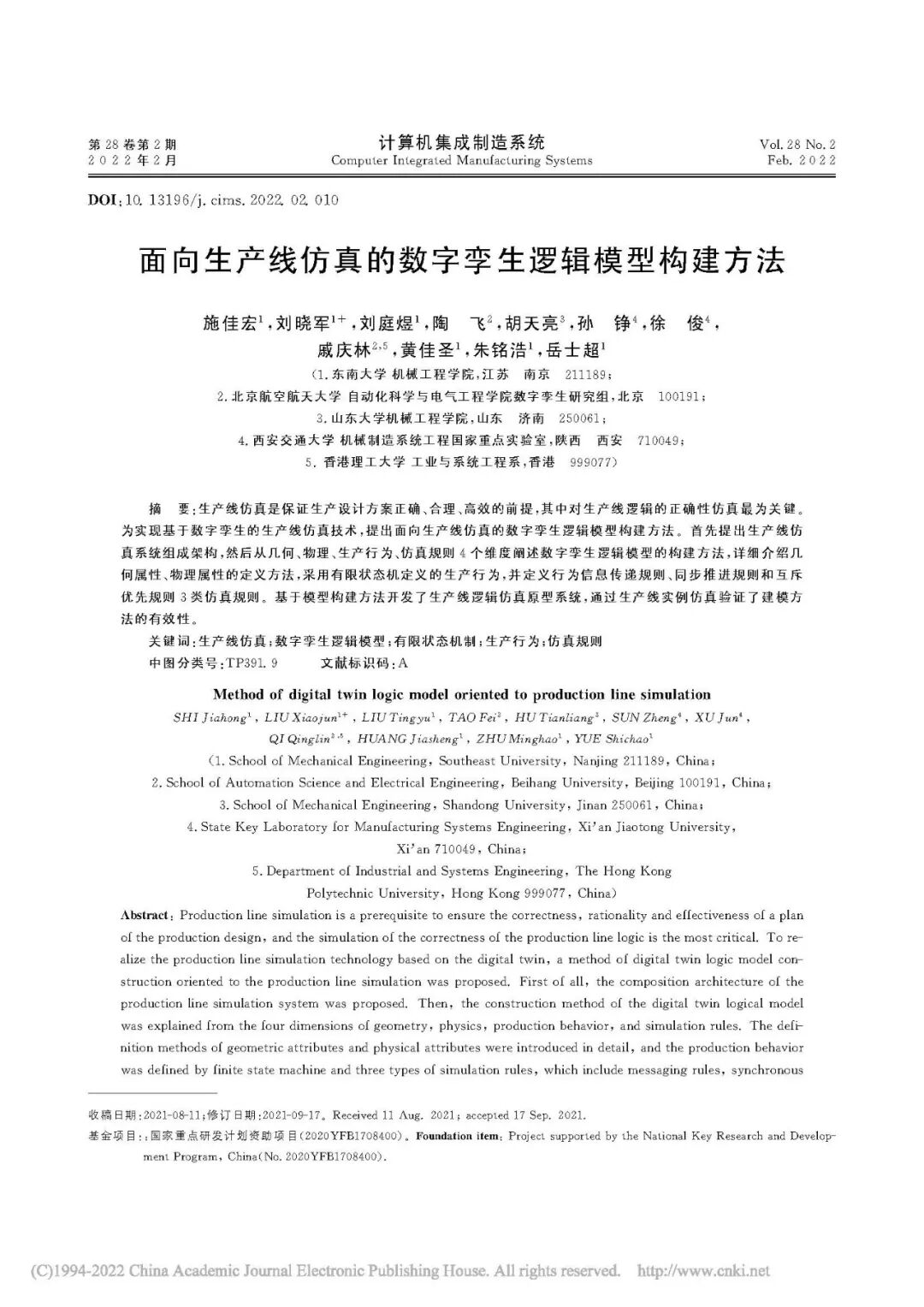 原 文 阅 读面向生产线仿真的数字孪生逻辑模型构建方法施佳宏1,刘晓军1+,刘庭煜1,陶飞2,胡天亮3,孙铮4,徐俊4,戚庆林2,5,黄佳圣1,朱铭浩1,岳士超11东南大学机械工程学院2北京航空航天大学自动化科学与电气工程学院