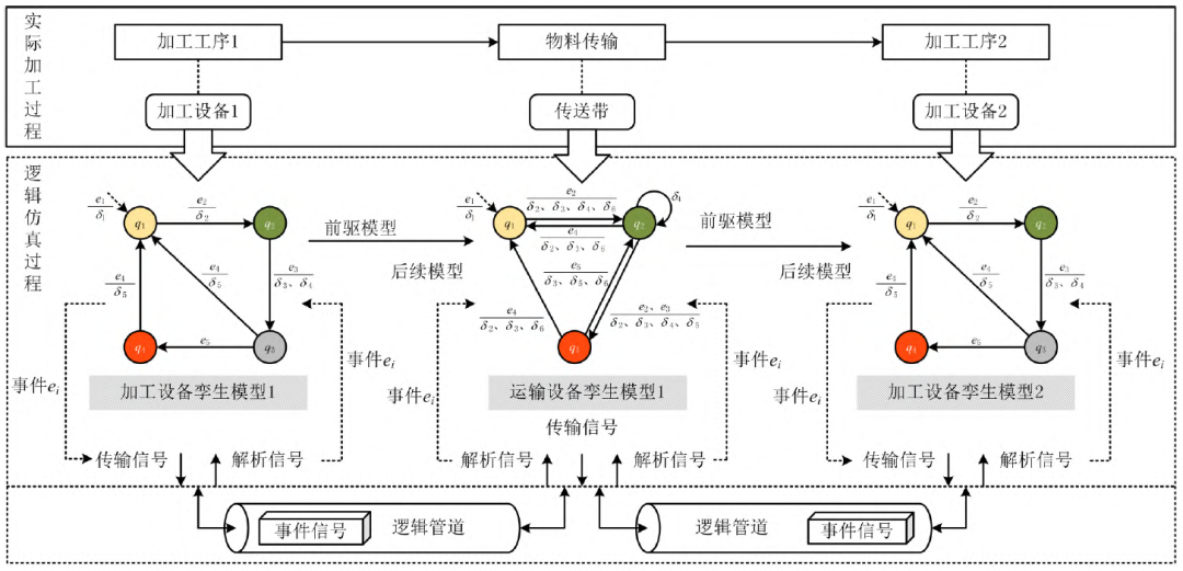其中,前驱和后续关系是相对的,前驱模型提供当前模型前一道加工工序的模型,后续模型提供当前模型后一道加工工序的实例化模型当模型对某些事件做出响应时,其状态发生转换,并将状态转换这一事件以信号的形式传输至逻辑管道,其前驱模型与后续模型读取逻辑管道中的事件信号后触发事件响应,做出相应的动作并改变其状态。