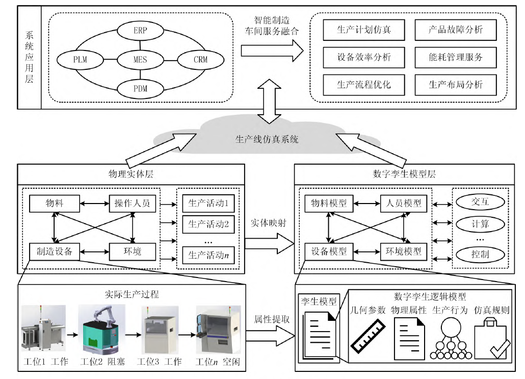 其中,物理实体层指“人—机—物—料”等客观存在的实体集合,负责执行车间生产活动,并提供物理空间的数据信息;数字孪生模型层是物理实体层的真实映射,数字孪生模型间相互关联协作,对物理空间中的各类生产活动进行仿真分析;系统应用层中,生产线仿真系统与各智能制造信息系统进行服务融合,实现生产计划仿真、设备效率分析和生产流程优化等功能。