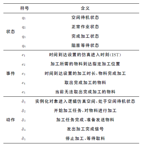 图3 加工设备模型的有限状态模型根据表1中状态、事件、动作和转换的定义,加工设备有限状态模型的状态转换过程如下:表1 状态、事件和动作