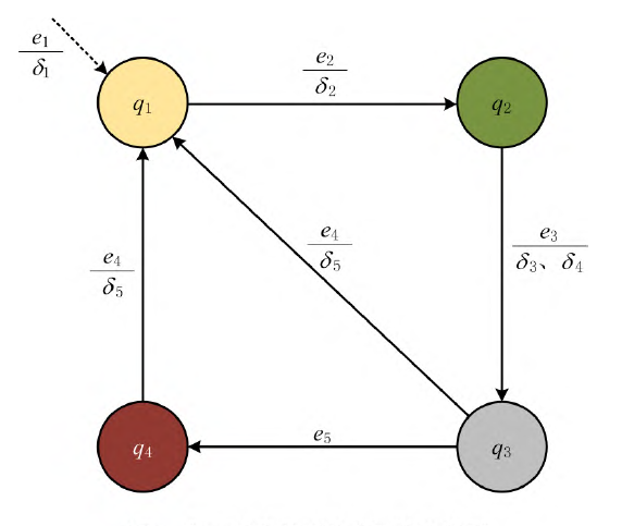 根据ROCHA等将UML序列图扩展绘制成有限状态机(Finite State Machine,FSM)的过程,本文通过有限状态机对数字孪生逻辑模型内部行为和外部输入事件的状态转移进行建模,描述模型在其生命周期内经历的有限状态序列,以及抽象模型因外部事件触发状态改变的所有情况。