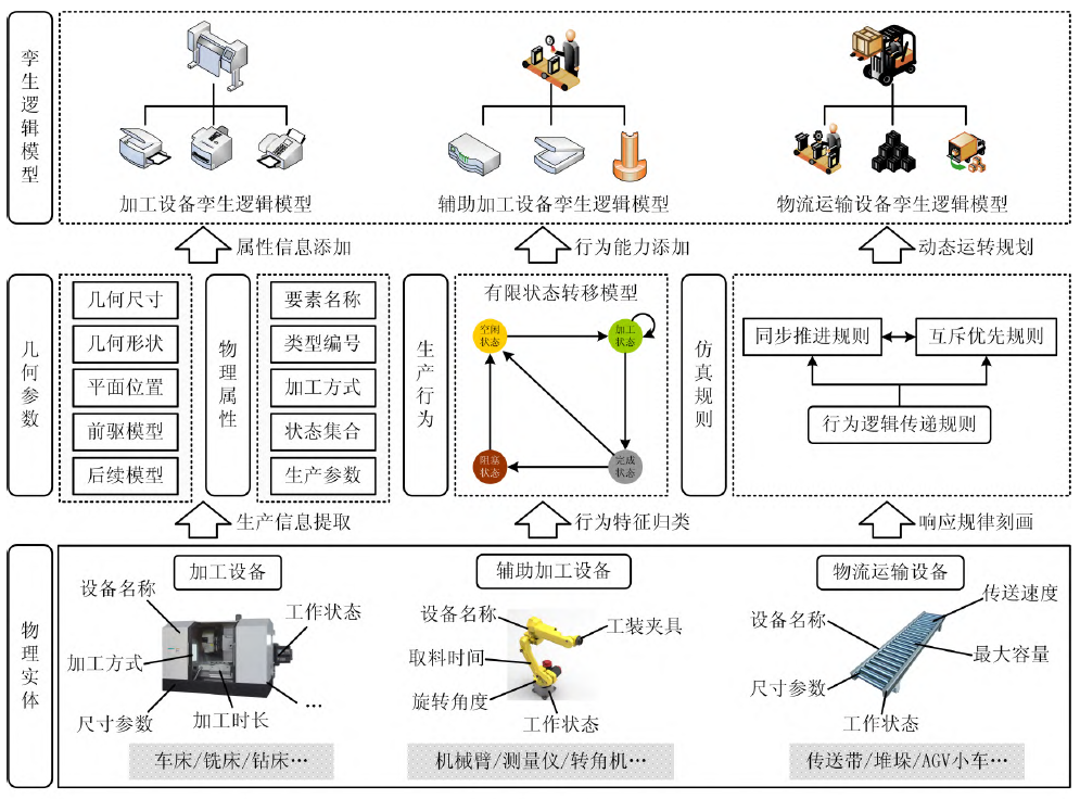 图1 生产线仿真系统组成架构3. 数字孪生逻辑模型的构建面向生产线仿真的数字孪生逻辑模型的构建过程如图2所示首先,以物理生产线中的实体为基础,提取生产过程中物理实体的尺寸信息、车间布局设计和实体加工方式等生产信息,作为数字孪生逻辑模型的几何参数和物理属性;然后,根据物理实体在实际生产过程中可能发生的生产行为,构建基于事件驱动的有限状态转移模型,使数字孪生逻辑模型具有行为特征、响应机制,以及进行状态转换的能力;最后,在几何属性、物理属性和生产行为的基础上,建立生产物理实体的数字孪生逻辑模型的仿真规则,通过制定模型间的同步推进规则和互斥优先规则,利用逻辑管道将仿真过程中产生的行为信息传递给相关联的模型,从而使各类模型设备具备演化、运转的能力。