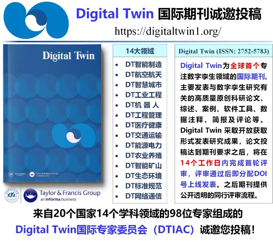 ↓↓↓http://digitaltwin1.org/欢迎关注、投稿,并加入编辑团队汇聚、分享、交流、碰撞关于论文介绍、成果发布、会议推广、企业进展、Call for Papers、团队介绍、论文推荐、科研交流等,请与我们联系。