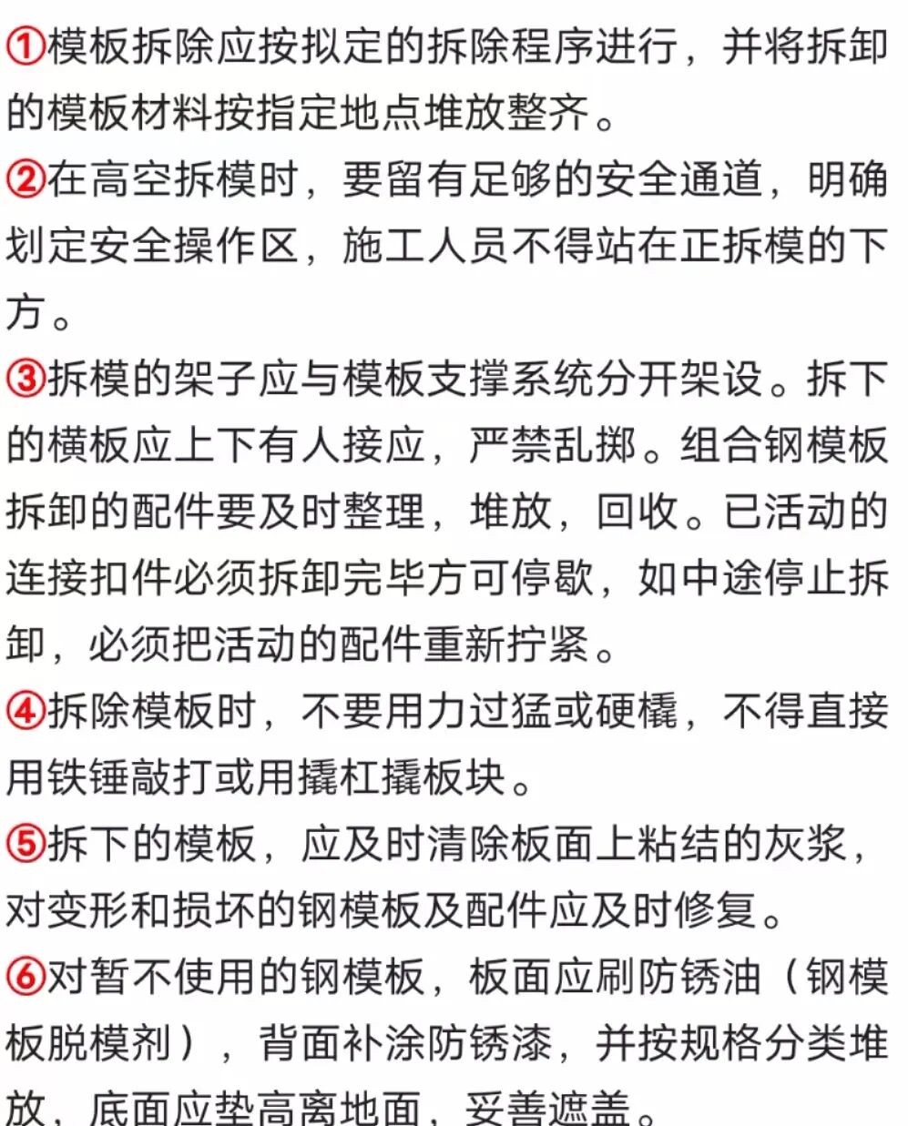 ①拆模的一般程序是:后支的先拆,先支的后拆;先拆除非承重部分,后拆除承重部分,并做到不损伤构件或模板。
