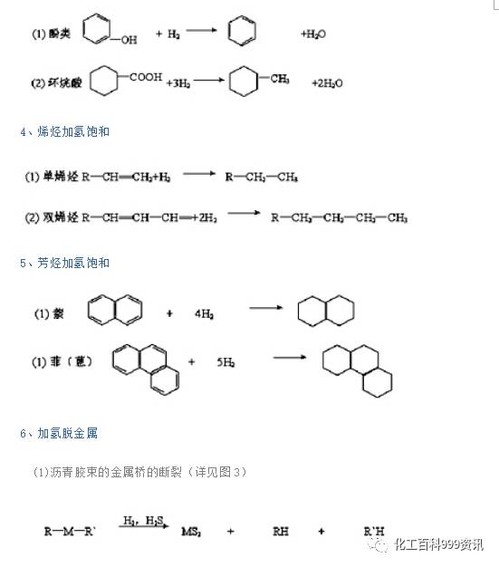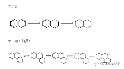 因受邻近苯核共振能的影响,苯胺的C-N键很难断裂,因此反应[Ⅲ]速度很慢,实际上很少发生。3、芳烃加氢反应历程一般馏分油的芳烃加氢主要指萘系或蒽(菲)系稠环芳烃的加氢。其反应历程如下。