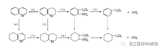 其中五元及六元氮杂环化物最难加氢脱氮。图2为在Ni-Mo/Al2O3催化剂上,3.4MPa、342℃时喹啉加氢脱氮的反应网络图。