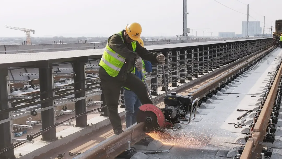 Tips:地铁建设中的“轨通”,分为“短轨通”和“长轨通”其中“短轨通”是指将一段段25m标准长的轨道全部完成铺设,形成一条连续的轨道;而“长轨通”则是把一根根钢轨进行无缝焊接,从而具备跑车调试条件▼轨道施工的现场是一派繁忙有序的景象,焊轨机、锯轨机、平板车等多达10台套专业机械设备昼夜运转,百余名管理人员与施工人员坚守岗位。