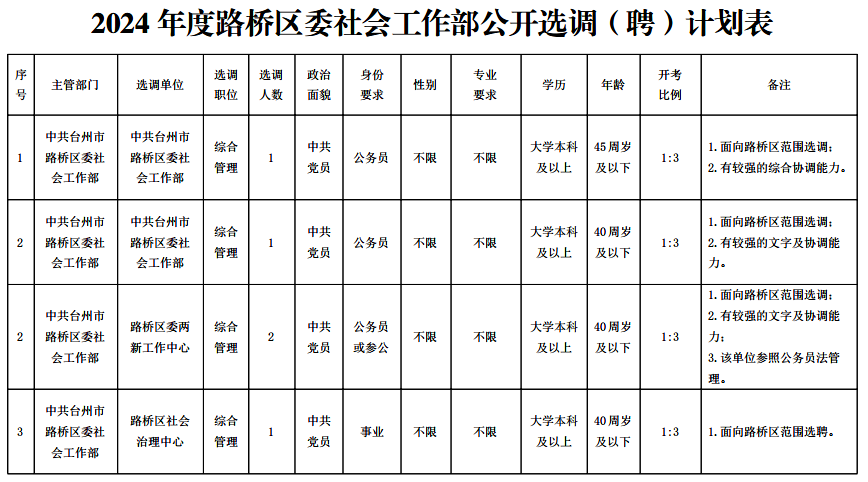 为进一步拓宽选人用人视野优化干部队伍结构经研究决定公开选调(聘)5名工作人员现将有关事项公告如下↓ ↓ ↓一选调(聘)职位和人数路桥区委社会工作部公务员2名路桥区委两新工作中心参照公务员法管理工作人员2名。