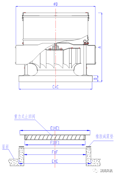 3)安装说明1.先将风机扣在泛水基础上,再用螺钉固定(安装方自理);2.屋顶泛水基础高度一般由设计工程师提供厂家建议为大于200mm,具体依据当地的降水量状况而定;3.橡胶减振垫由施工单位提供,其厚度根据风机的总量来定。