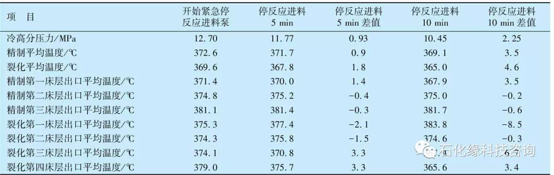 图2 冷高分压力变化趋势(2018-09-10)表2列出了2018-09-10的冷高分压力与反应器床层出口温度从表2可以看出,在停止反应进料5 min时,冷高分压力降低0.93 MPa,精制平均温度降低0.9 ℃,裂化平均温度降低1.8 ℃,精制第一床层出口温度下降1.4 ℃,精制第二、第三床层出口温度略有上升,裂化第一、第二床层出口温度略有上升,裂化第三、第四床层出口温度均下降3.3 ℃;在停止反应进料10 min时,冷高分压力降低2.25 MPa,精制平均温度降低3.5 ℃,裂化平均温度降低4.6 ℃,精制第一床层出口温度下降3.5 ℃,精制第二、第三床层出口温度略有上升,裂化第一床层出口温度上升8.5 ℃,裂化第二床层出口温度上升0.3 ℃,裂化第三床层出口温度下降6.7 ℃,裂化第四床层出口温度下降3.4 ℃。