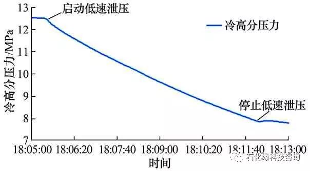 18∶05∶30启动0.7 MPa/min低速泄压,18∶12∶00关闭低速泄压阀,冷高分压力为7.81 MPa,反应系统氢气循环降温,分馏系统短循环,等待氢气恢复开工冷高分压力变化趋势见图1