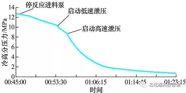 启动2.1 MPa/min高速泄压。01∶25∶00冷高分压力降至0.7 MPa,停止高、低速泄压,反应系统氮气置换降温,分馏系统短循环,等待氢气恢复开工。冷高分压力趋势见图2。