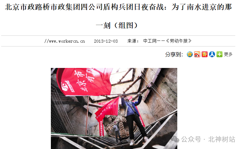 图片及内容来源:中工网——《劳动午报》2013年11月25日,全长13.455米、直径6.14米的盾构机破土出洞,标志着北京市南水北调配套工程东干渠工程施工难度最大的标段之一、单线掘进距离长达3164米的南水北调东干渠10标隧道区间,