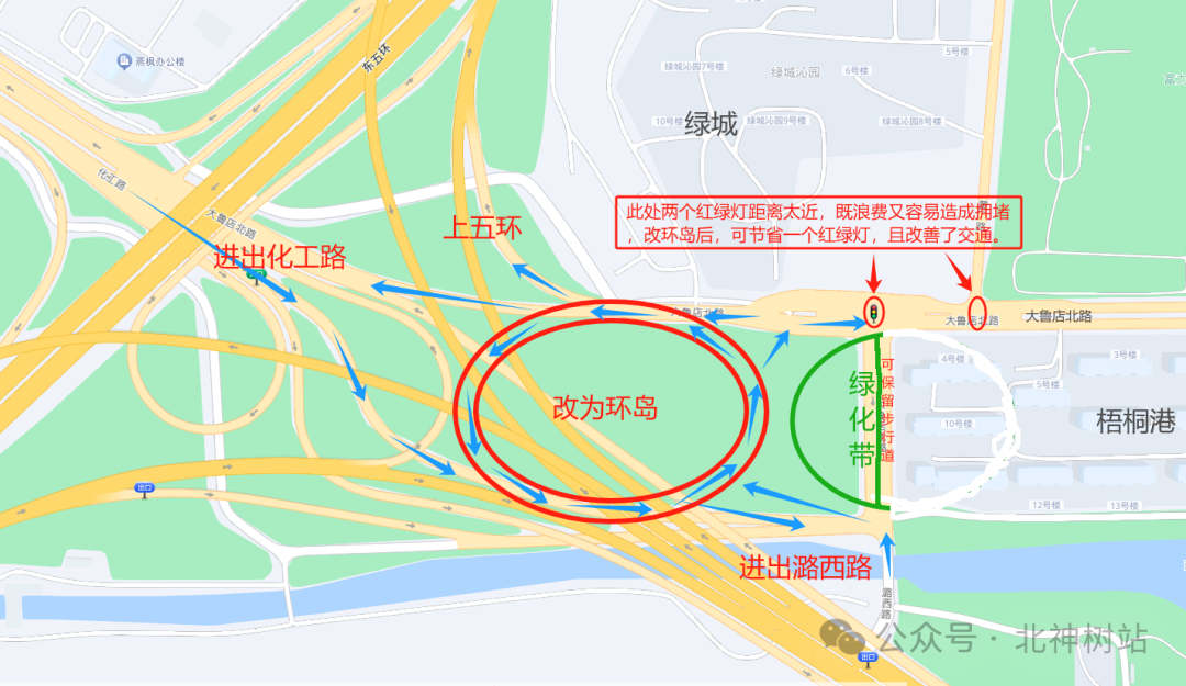 图片为邻居自制(仅供参考)上图是梧桐港小区提供的关于大鲁店北路建设环岛建议,或能缓解该区域交通问题,您认为该方案可行性如何?文末可参与调研。
