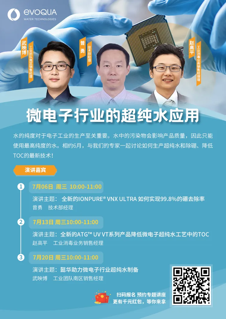 直播时间7月06号(周三)上午10:00-11:00演讲人曾勇技术部经理演讲主题全新的IONPURE® VNX-ULTRA如何实现99.8%的硼去除率全新的ATGTM UV VT TOC系列专为微电子行业超纯水工艺中去除TOC而设计