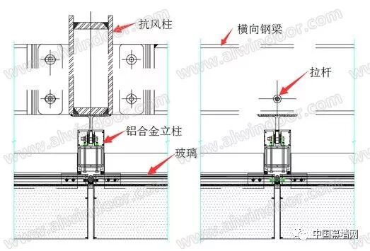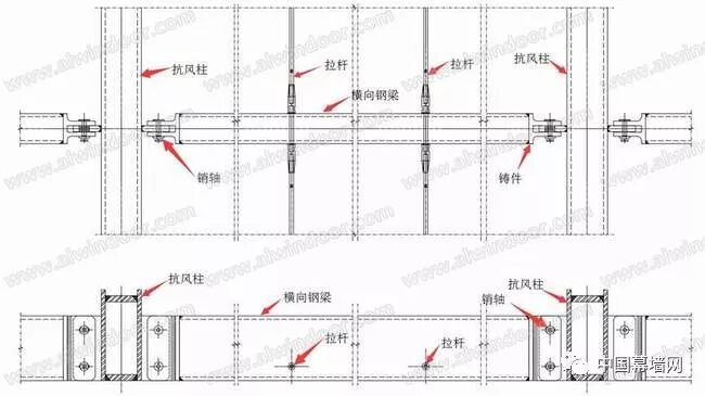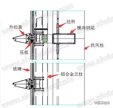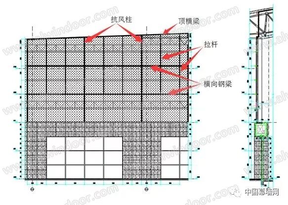幕墙水平荷载传递路线: 玻璃面板→铝合金横梁→铝合金立柱→钢结构系统→主体结构 幕墙自重荷载传递路线: 玻璃面板→铝合金T型件→铝合金立柱→钢结构系统→主体结构