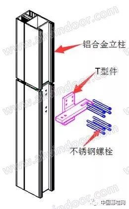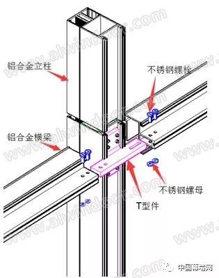 为解决这一问题,引入了点式玻璃幕墙夹板承受玻璃自重的思路,幕墙设计采用了6061-T6铝合金T型件,直接承受玻璃传来的重力荷载,同时,铝合金T型件用来固定铝合金横梁,承受铝合金横梁传来的水平荷载(见图6~图9)。