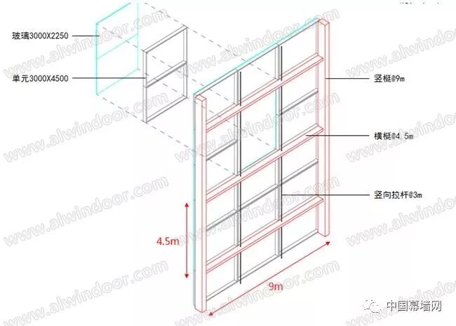 图4 竖剖节点 玻璃幕墙标准板块基本构造体系,立面以9米左右为一个基本单元,每个基准单元再均分为三等分。(见图5)