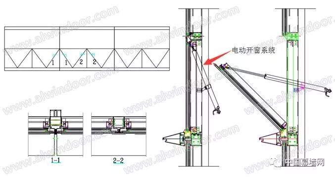 2.3大板块幕墙-电动开启系统 根据《青岛新机场航站楼消防安全性能评估报告》对大空间排烟的要求,在屋面大厅侧天窗,指廊顶天窗以及大板块玻璃幕墙设置消防联动的电动开启扇,总量约2100余扇,规格:宽1500x高1150,玻璃同样采用12(超白)Low_E(双银)+12Ar+10+2.28pvb+8mm钢化夹胶中空玻璃,单扇重量约150公斤,最大开启角度45°;开启扇配置多点锁驱动器,结合电动开启装置实现消防联动的要求(见图14)。