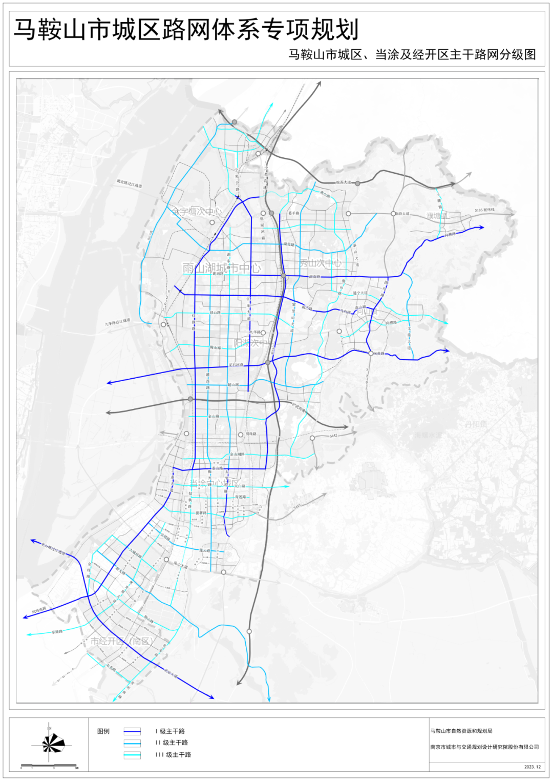 本次规划形成 “五横六纵”的Ⅰ级主干路网布局,构建“雨山湖中心交通保护环”“秀山次中心交通保护环”及“当涂县中心交通保护环”,形成“保护中心,疏密有致”的高等级干线路网,总里程约127.0千米重点满足“一主三副”城市中心体系以及当涂、经开区、向山濮塘等各城市功能组团建的交通联系,同时避免通过性交通穿越城市中心区;。