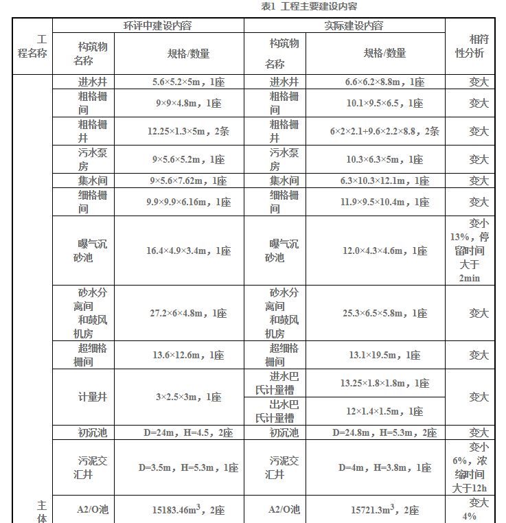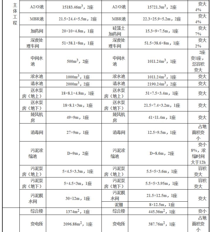 A/A/O池及MBR池、污泥脱水间、污泥浓缩池、变电所、清水池及中间水池浓水池、深度处理车间。工程主要建设内容见表1。