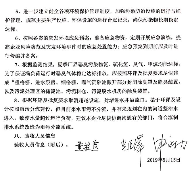 七、后续要求及建议1、加强各污水处理工序的运行管理,定期对污水处理设备进行保养维护,维持生化系统稳定运行,保证污水处理厂出水水质达到排放及回用水标准2、定期排渣、排泥,并做好栅渣、污泥的暂存,按环评要求的处置方式合理处置。