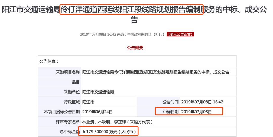 伶仃洋通道西延线阳江段线路规划报告编制服务也开启,采购金额为181.3万元。