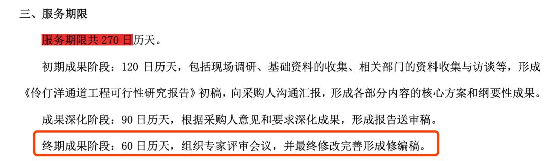 ▲图/中国政府采招网时间节点上,服务期限共 270 日历天 初期成果阶段:120 日历天,包括现场调研、基础资料的收集、相关部门的资料收集与访谈等,形成