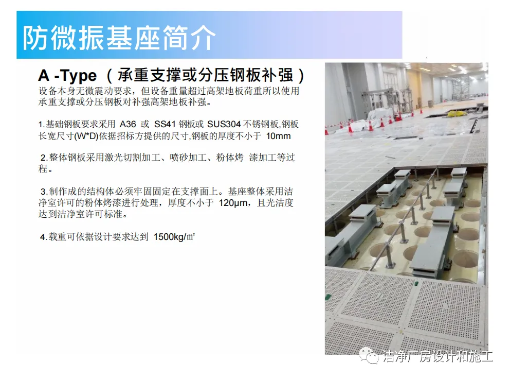 3.适用范围适用于经过调试并已经具备一定洁净度等级的洁净厂房内,对基础有一定微振动要求的设备4.工艺原理将平台设立在地面或者格栅板上,与原有的活动地板分离,使之不与活动地板相互传递振动,阻隔相邻设备所产生的防微振。