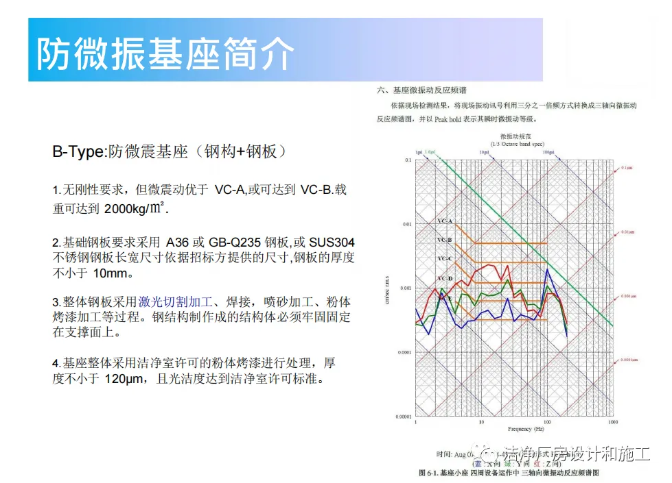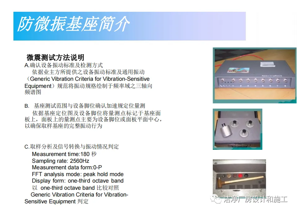 需要说明的是:测试是以1/3的频谱分析频宽8~100HZ的振动植(dB值的参考速度值为10-6in/sec加工尺寸是参考电子制造业的线宽、医学和药学研究的粒子或者细胞尺寸等,所列数值是药学研究和精密设备的振动观察值。
