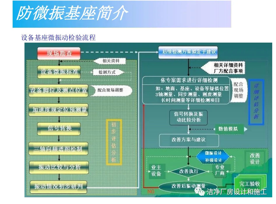 通过自身的结构构造,将防微振动控制在振动规范或设备对基础的要求之内,能够独立吸收来自设备本身运作产生的振动的能量,避免洁净室建筑结构(比如楼板、梁等)所产生的防微振动对其产生影响5.施工工艺流程及操作方法