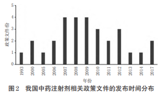 2 结果2.1中药注射剂相关政策文件基本情况我国国家层面的中药注射剂政策文件最早发布在1993年为了解决中药注射剂不良反应/不良事件频发的问题,从2007年起我国进入中药注射剂专项政策发布密集期(图2)。