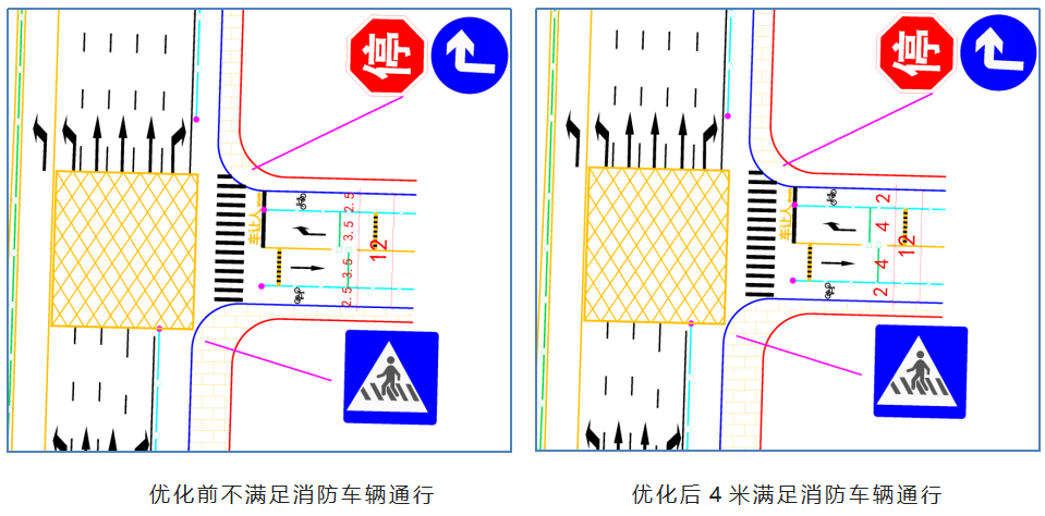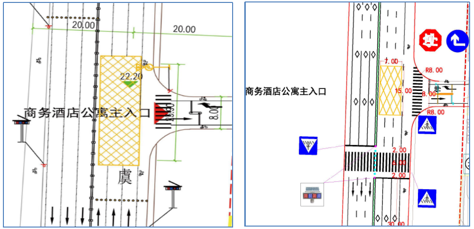 出入口标志标线设计前后对比二是,其他交通安全设施设置不足未根据项目实际,在项目内部及周边设置必要的交通标志、隔离、防撞等安全设施,无法保障交通参与者通行安全三是,标志、标线设置相互矛盾标志标线设置不一致,标志版面内容与道路实际情况、地面标线不匹配,易误导驾驶员导致违法行为或交通事故的发生。