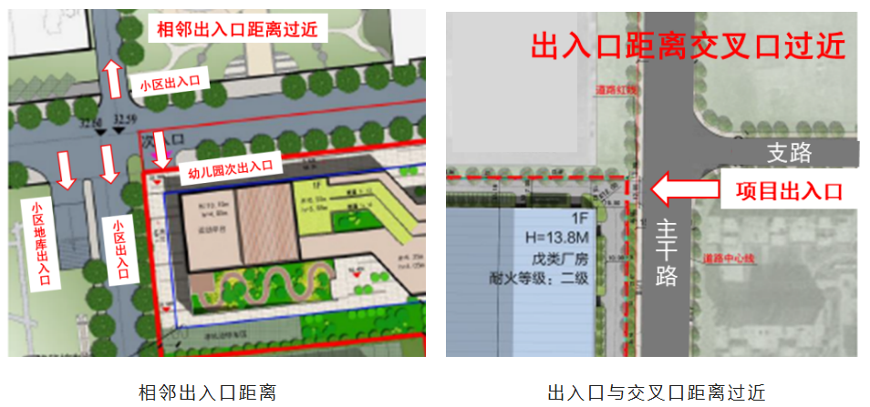 二是,出入口位置不合理出入口作为城市道路与建筑间的衔接点,若出入口所处位置距离相邻路口、项目出入口过近或形成错位等,与项目自身特征、道路功能定位、路网规划等不符,将对项目周边现状交通运行带来极大的交通运行隐患。