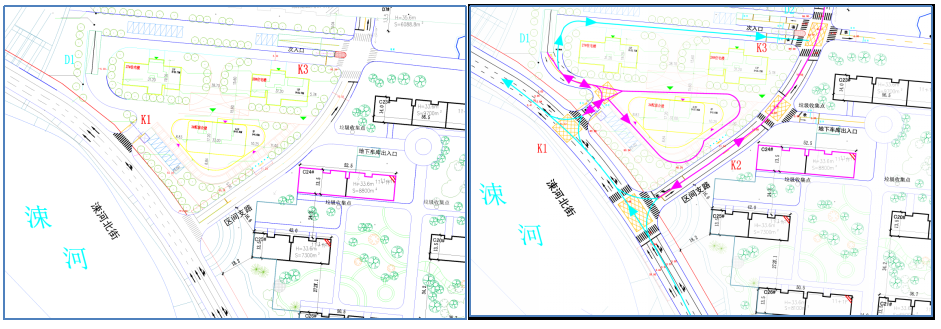 项目内部交通设施优化前后情况对比(3)缺乏内外交通衔接设计方案一是,缺乏交通组织流线设计未对项目投入使用后的内外机动车、非机动车、慢行、消防等交通组织流线进行设计,投入使用后易产生大规模拥堵现象二是,缺乏交通诱导设计工作。