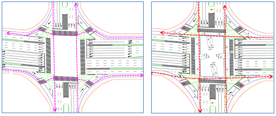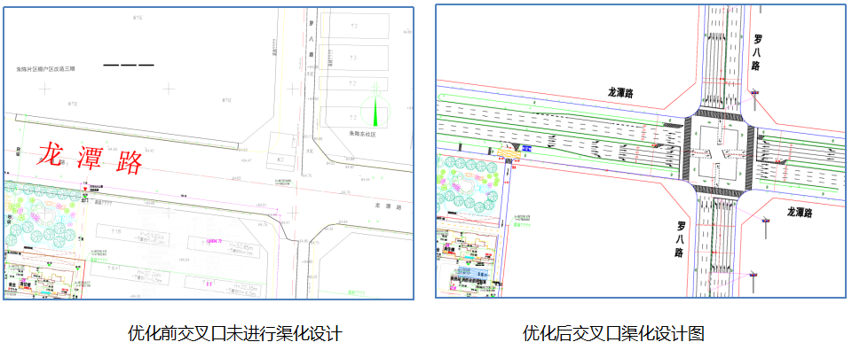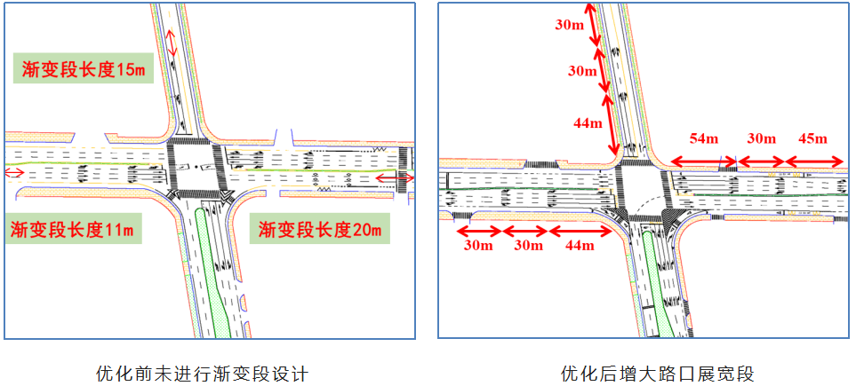 二是,交叉口展宽段设置不合理。项目未充分考虑交通需求,引导段、缓冲段、渐变段设置不足,交叉口容错空间及存车空间不够,极易在渐变段处形成交通瓶颈。