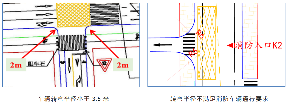 (2)出入口设计不满足规范要求一是,出入口转弯半径不满足通行要求出入口转弯半径设计时未综合考虑项目用地性质、通行车辆车型分布、行车速度等因素,出入口转弯半径过小,车辆容易侵入路缘石范围内,半径过大会导致车辆转弯速度过快,存在较大的交通安全隐患。