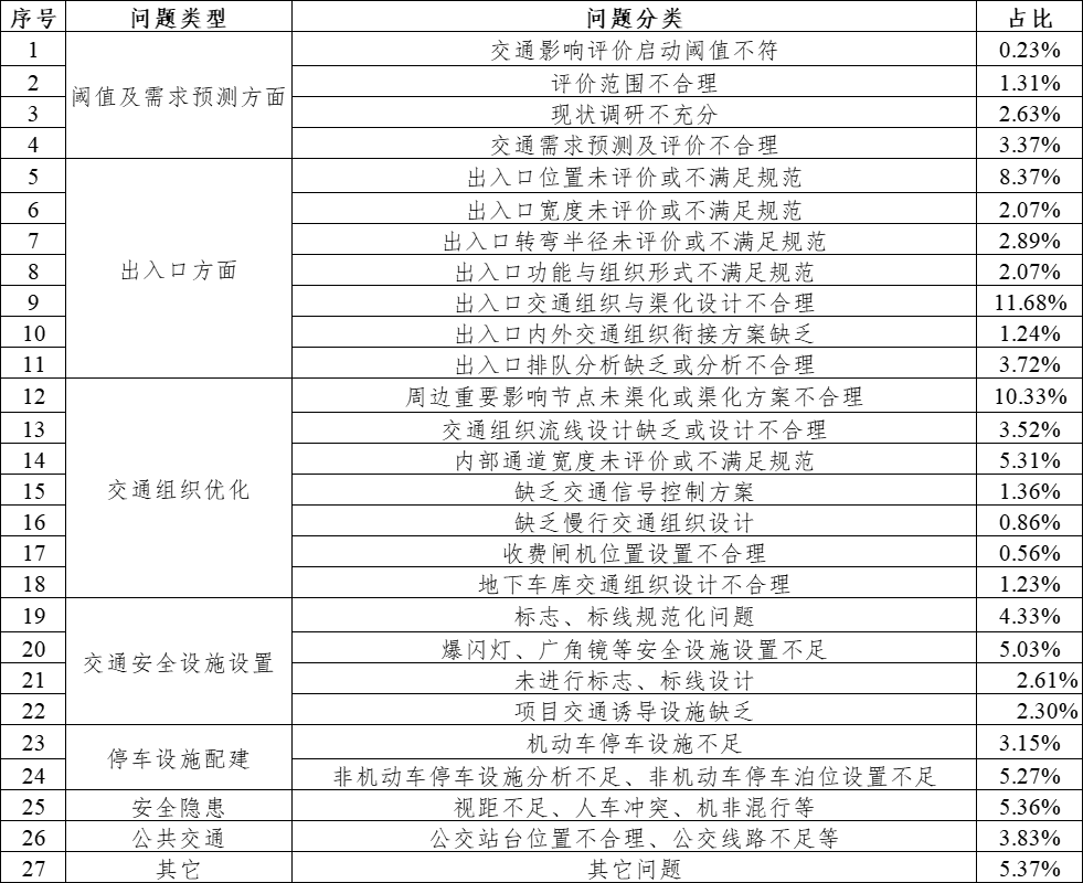 02交评审查工作中常见问题以我们在某个城市持续开展的建设项目交通影响分析与评价审查项目为例,服务团队平均每年完成超50个新、改(扩)建项目交评报告的技术审查和评审工作,进行160余次审查,提出770余条优化设计意见(常见咨询问题和所占比例情况见下表),采纳率达96.7%;通过交通影响评价审查机制,平均每年从源头能够避免约122处潜在交通拥堵点、60处安全隐患点,可节约建设资金近7000万元。